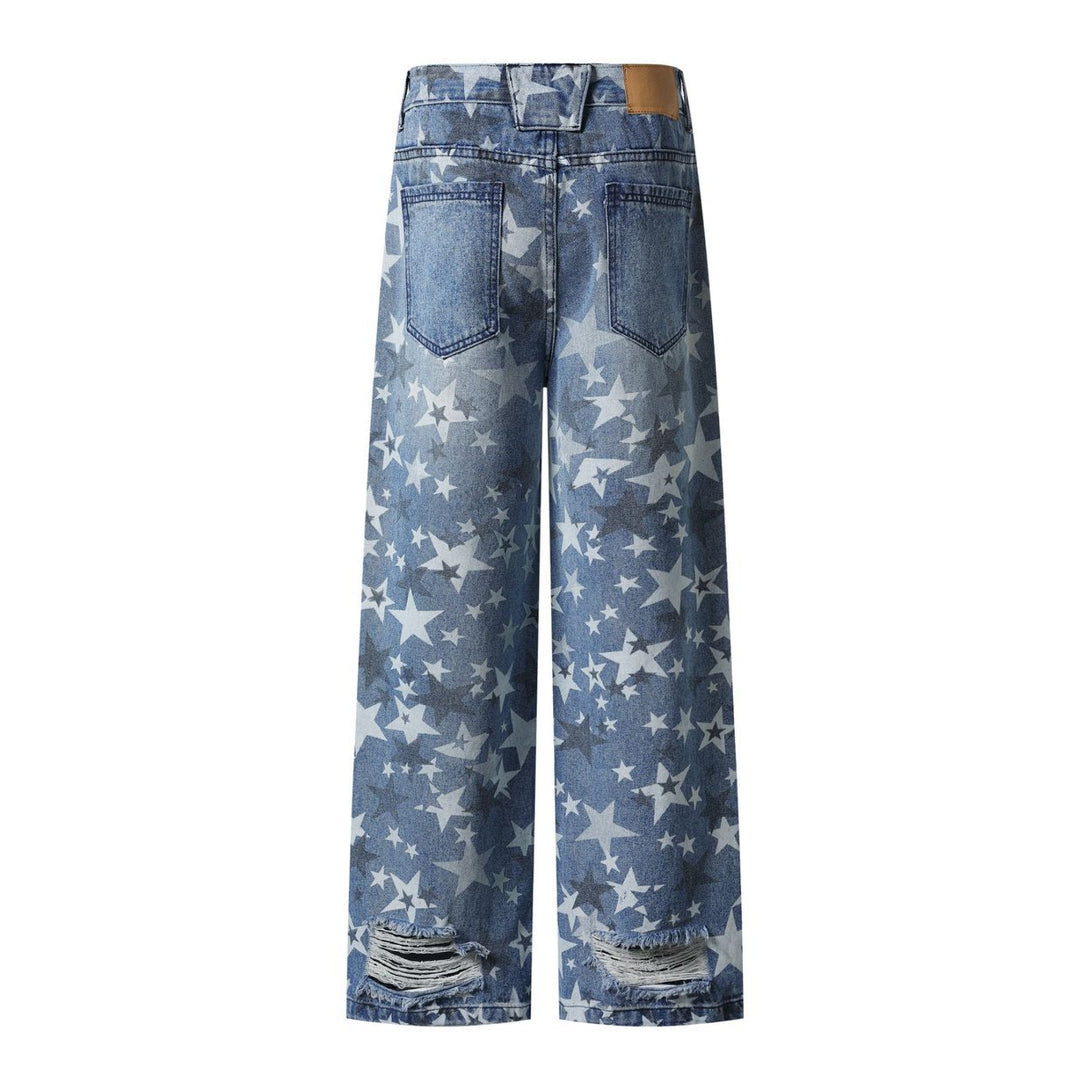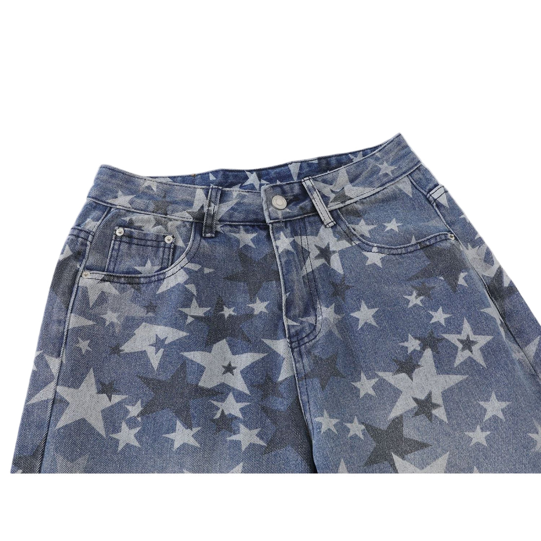 Celestial motifs meet oversized denim construction in this wide-leg statement piece. Scattered star print across premium cotton blend creates visual texture that bridges vintage Americana with contemporary street sophistication. Mid-rise waist and relaxed proportions deliver effortless wear that transcends seasonal boundaries.