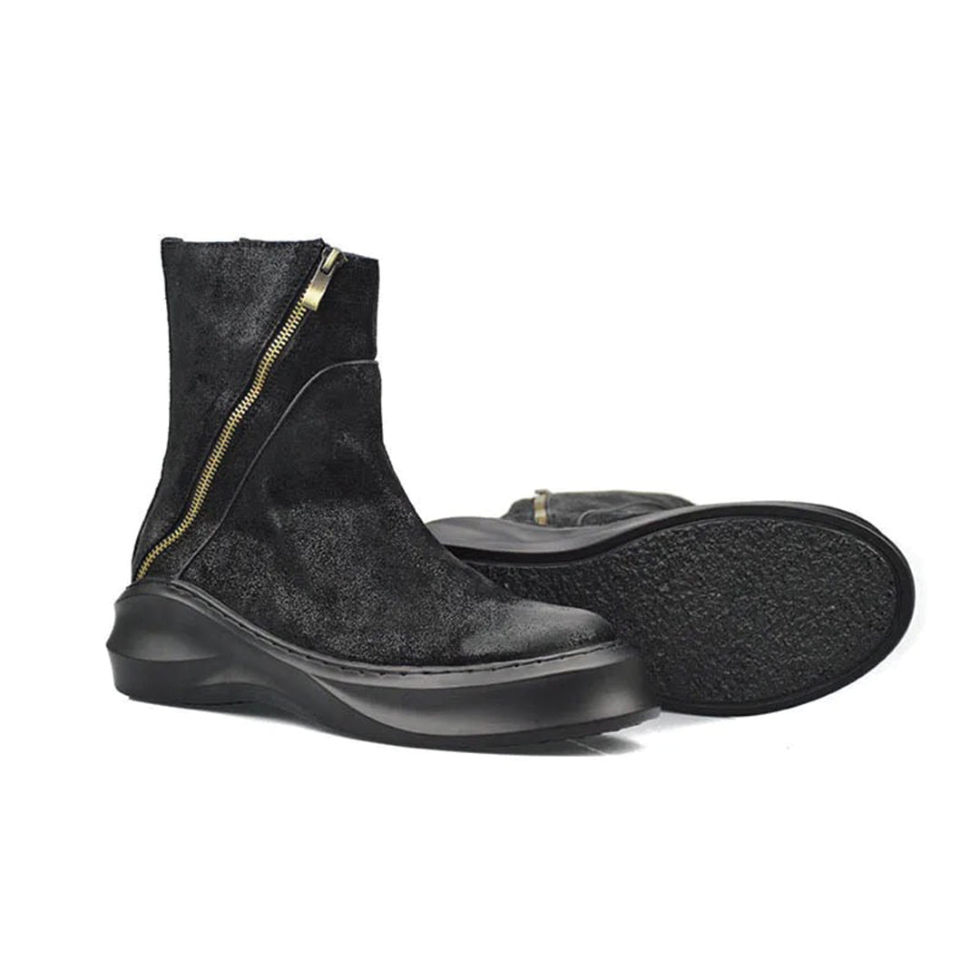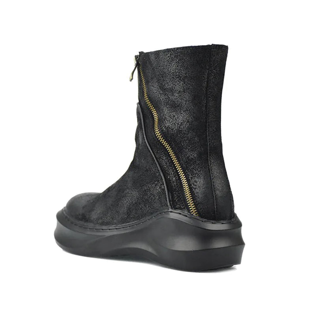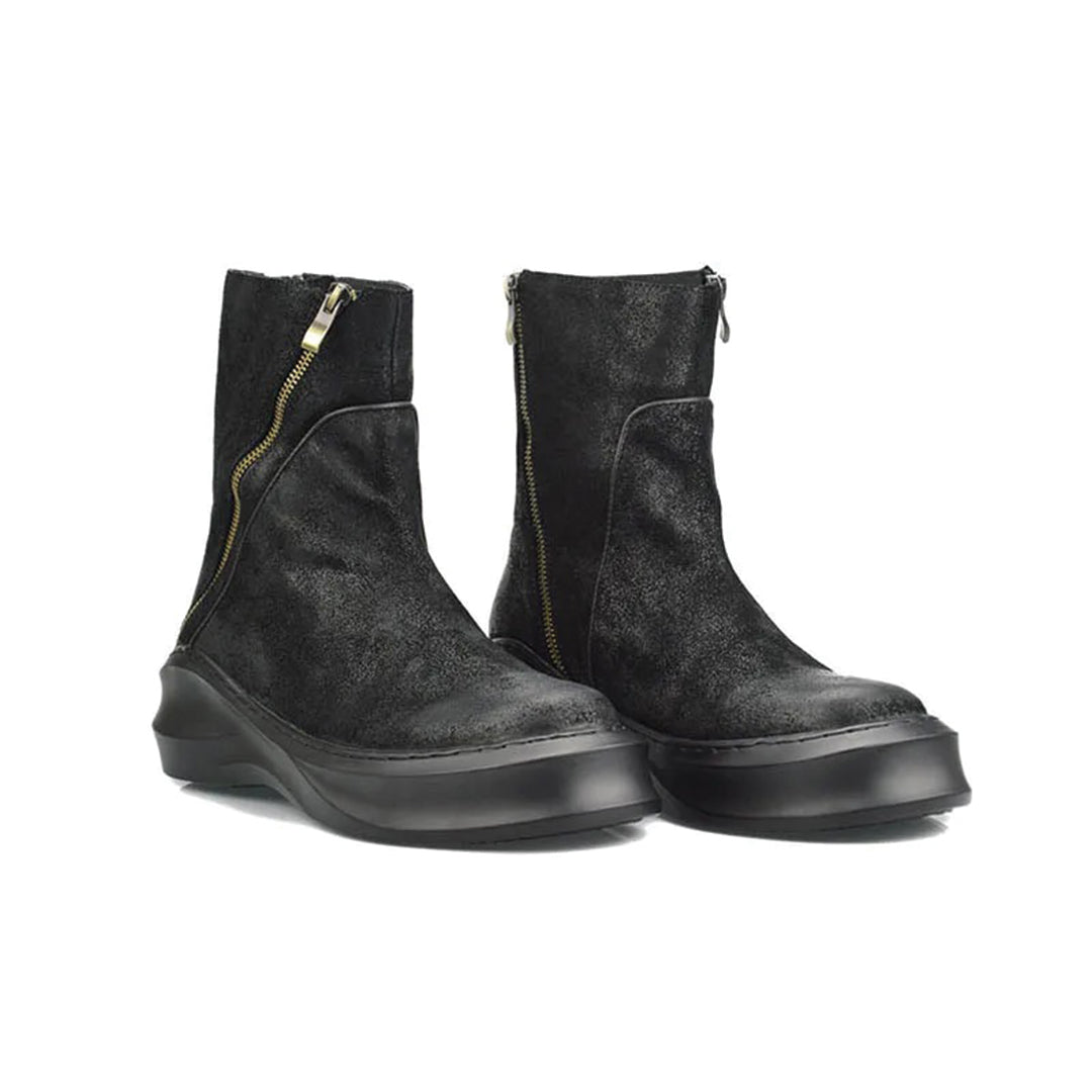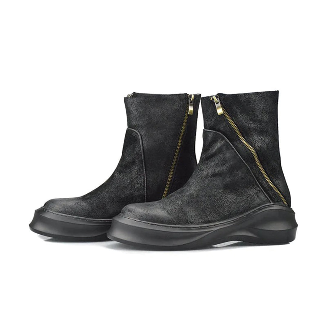 When function becomes sculpture. Premium cowhide leather and suede construction meets gravity-defying platform architecture that redefines what ground contact means. Precision-placed zipper systems navigate architectural curves while inflated sole technology delivers cloud-like suspension across industrial-strength foundations. These aren't boots that follow terrain—they create their own landscape, built for those who understand that the future walks differently.