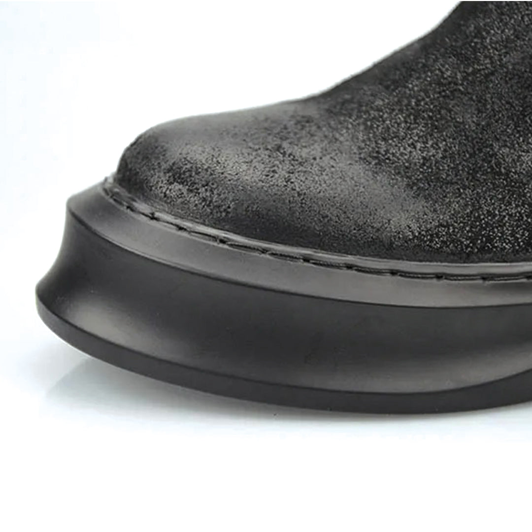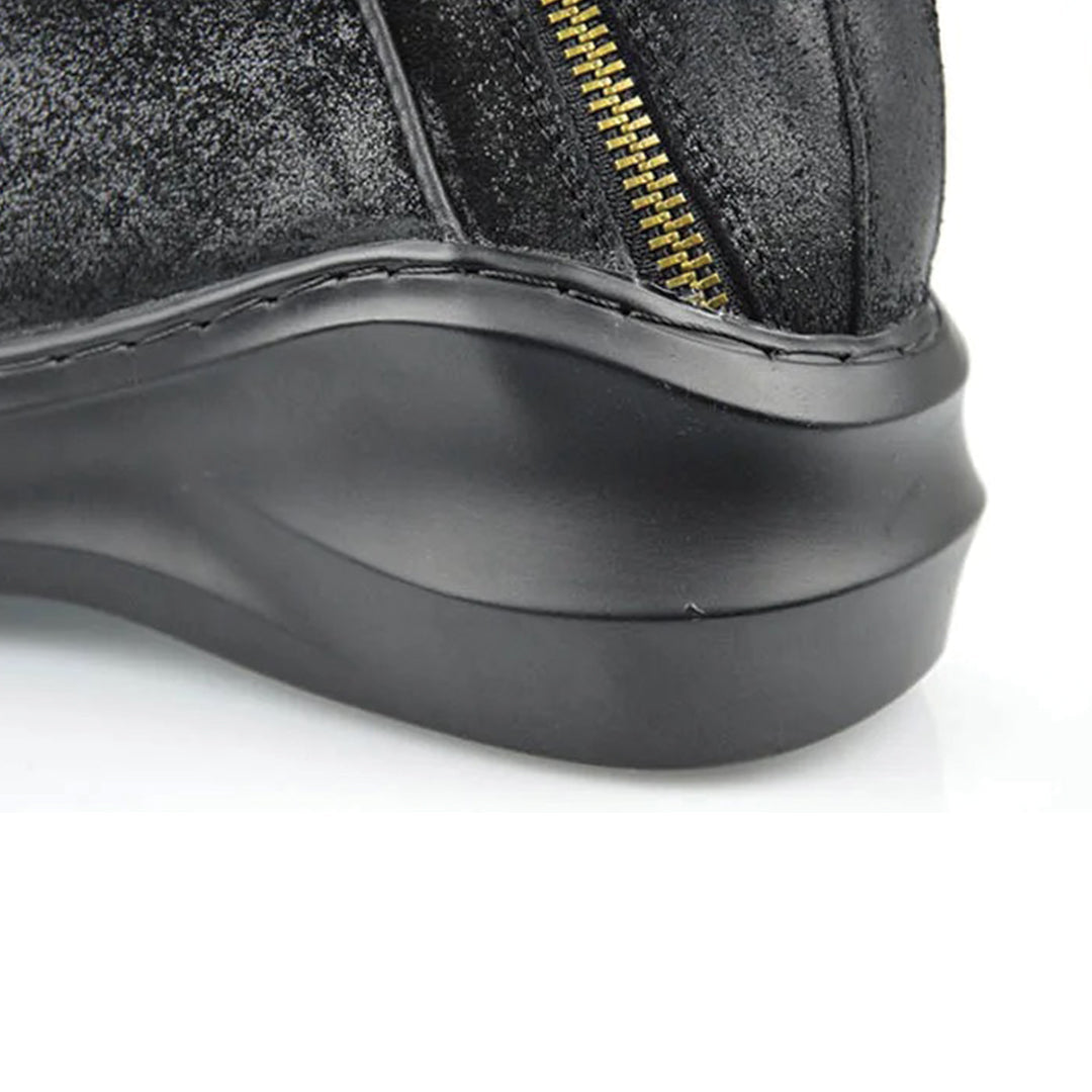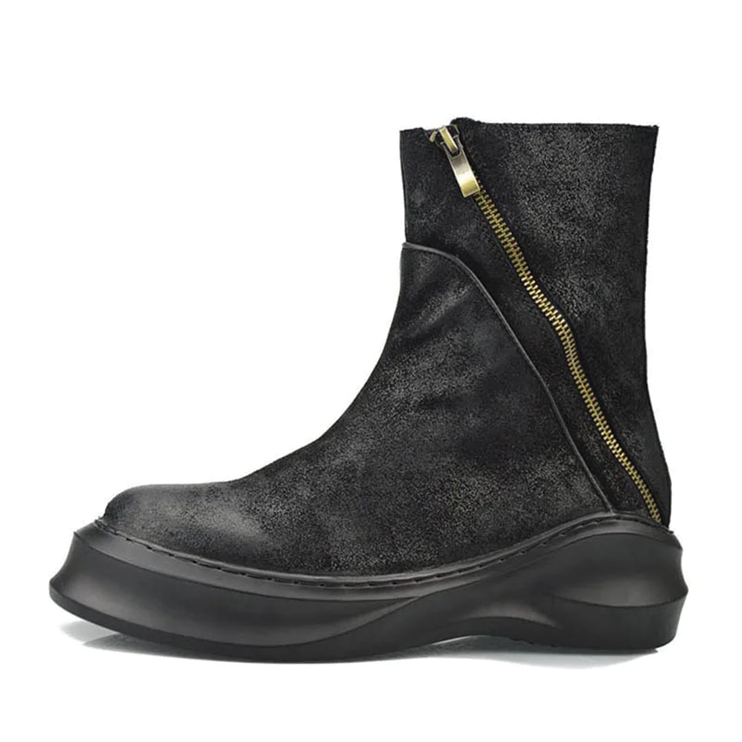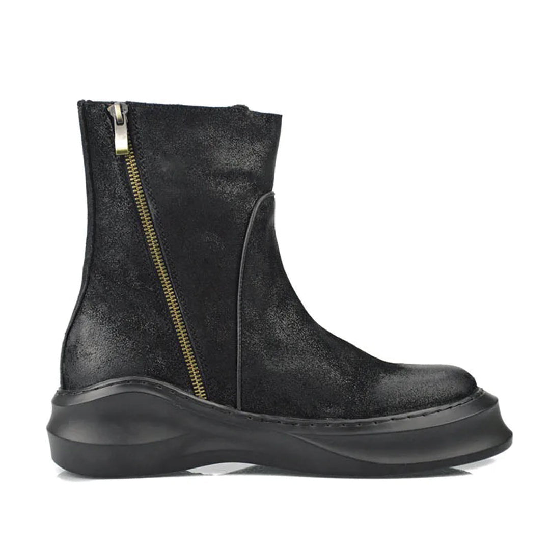 When function becomes sculpture. Premium cowhide leather and suede construction meets gravity-defying platform architecture that redefines what ground contact means. Precision-placed zipper systems navigate architectural curves while inflated sole technology delivers cloud-like suspension across industrial-strength foundations. These aren't boots that follow terrain—they create their own landscape, built for those who understand that the future walks differently.