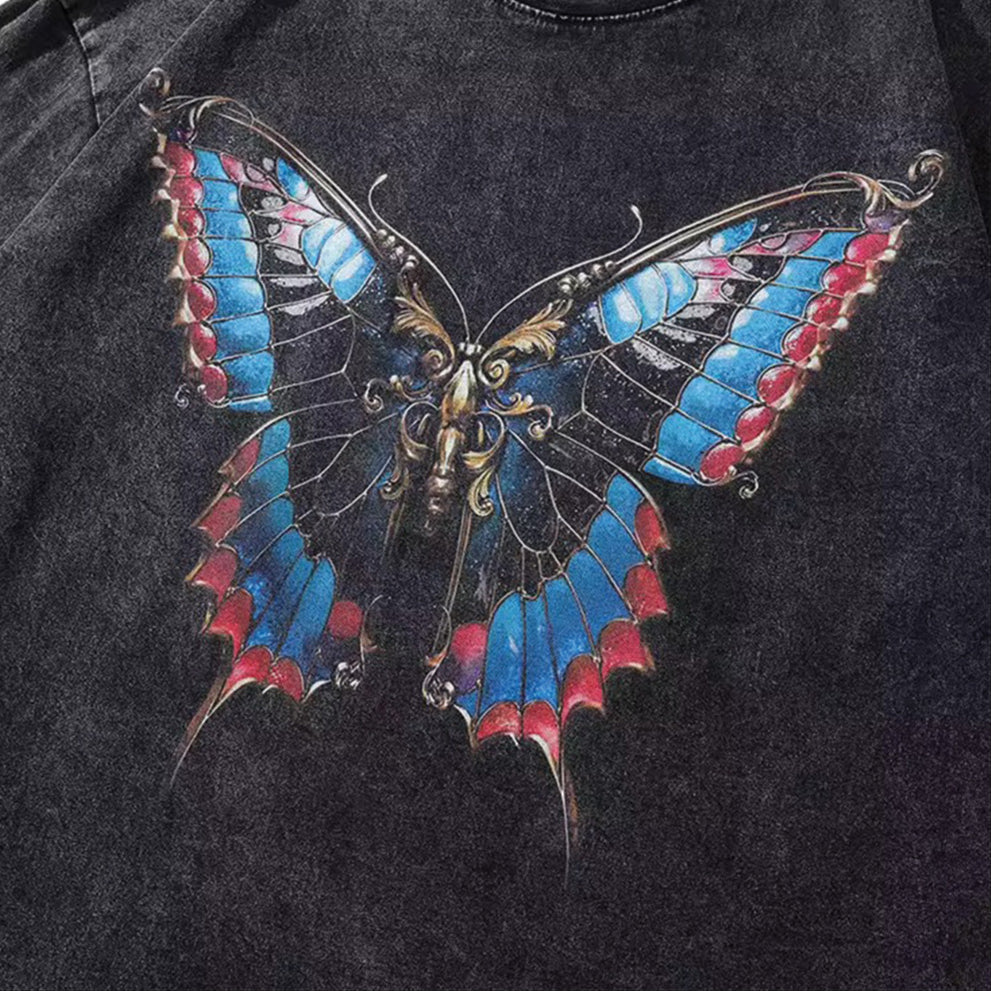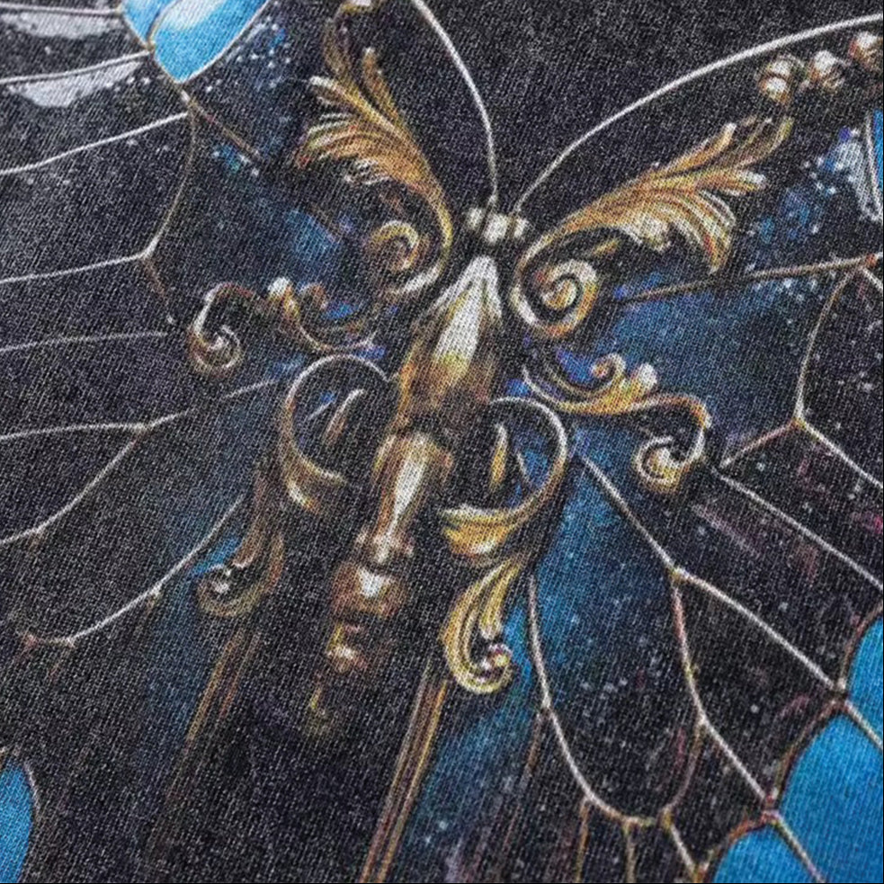 Artisanal baroque butterfly printing meets premium washed black cotton in an oversized construction built for gothic daily expression. The intricate multi-layer graphic process creates detailed wing patterns that maintain vibrancy through regular wear, while the loose silhouette and tonal fade finishing deliver instant vintage comfort.