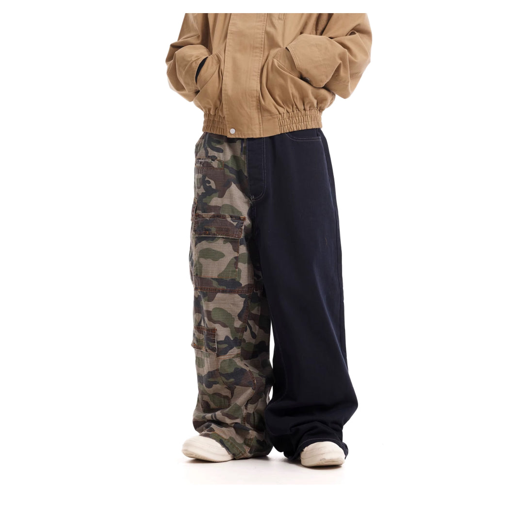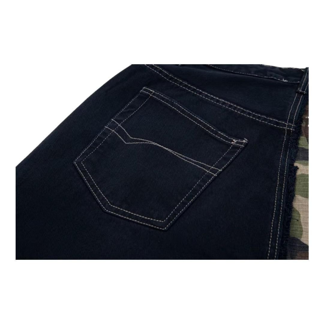 These split-design pants blend rugged camouflage cargo details with classic washed denim, offering a bold contrast that commands attention. With a relaxed fit, they seamlessly combine streetwear influence and functional style, making them a perfect choice for those who embrace individuality and daring fashion.