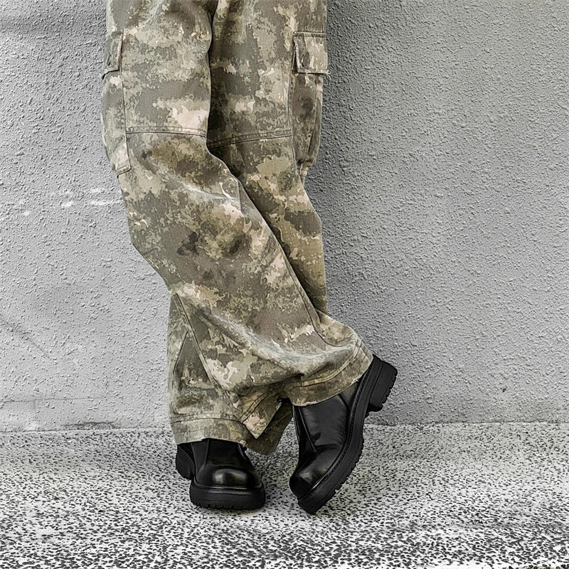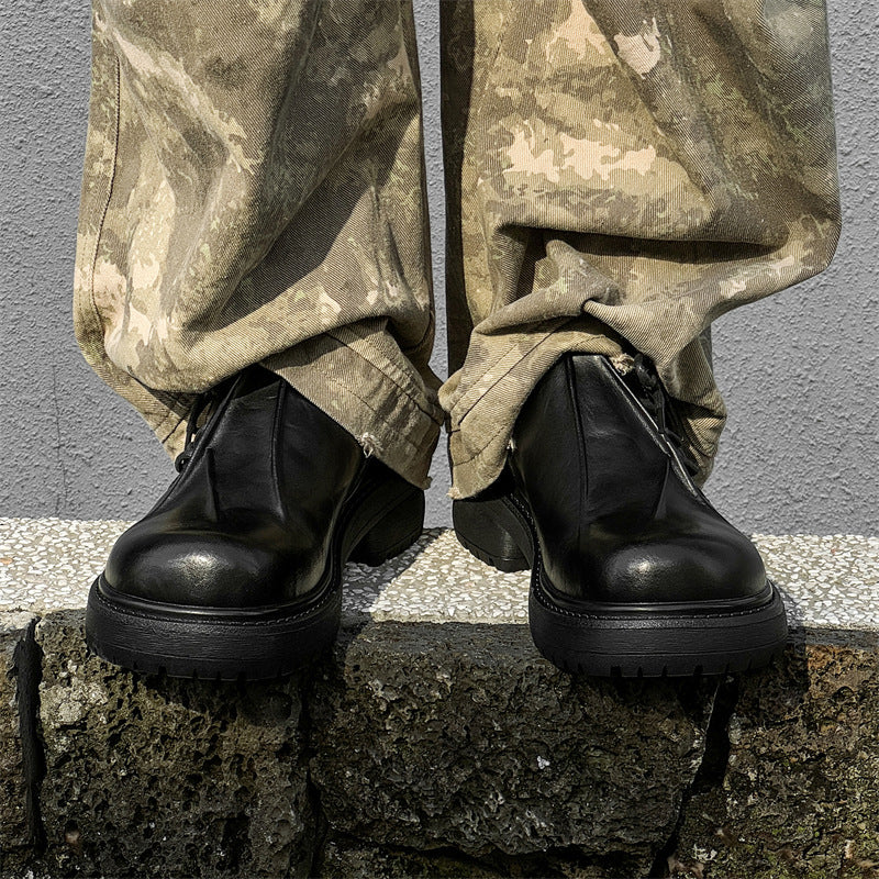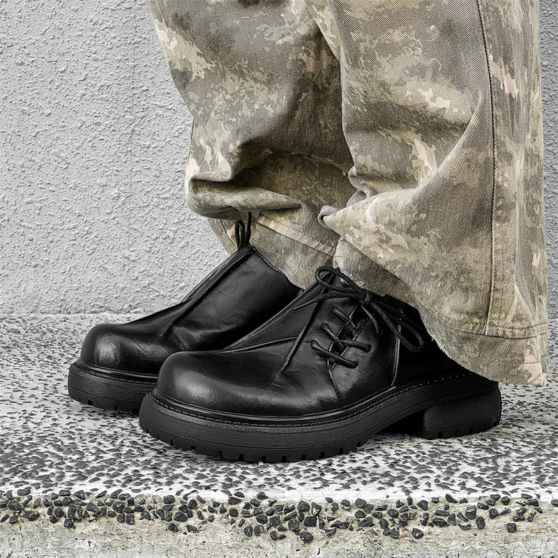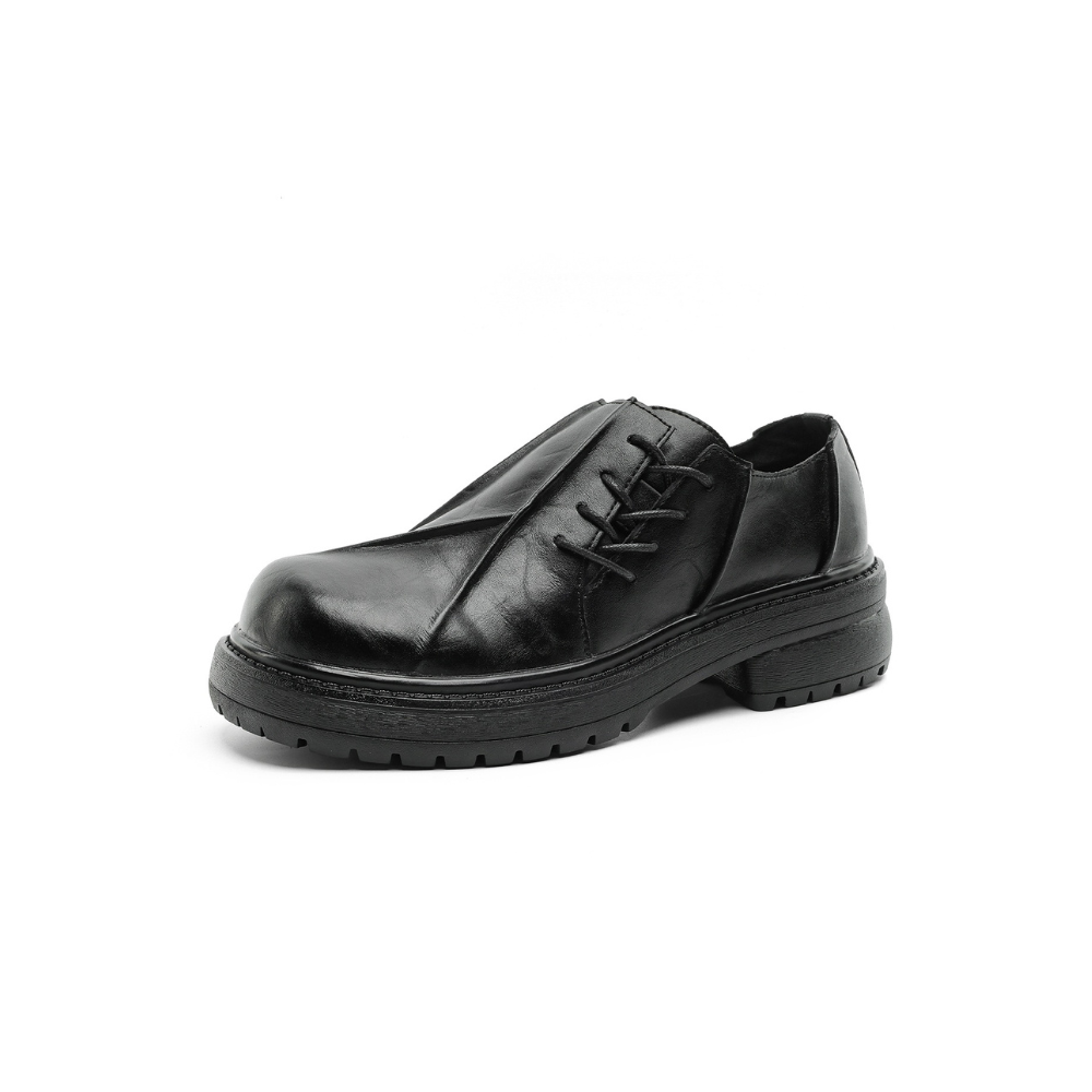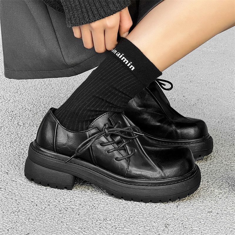 Synthetic leather construction with substantial platform rubber sole and round-toe architecture. Lace-up design with low-cut silhouette. Available in standard and height-increasing variations.