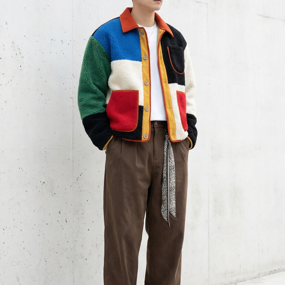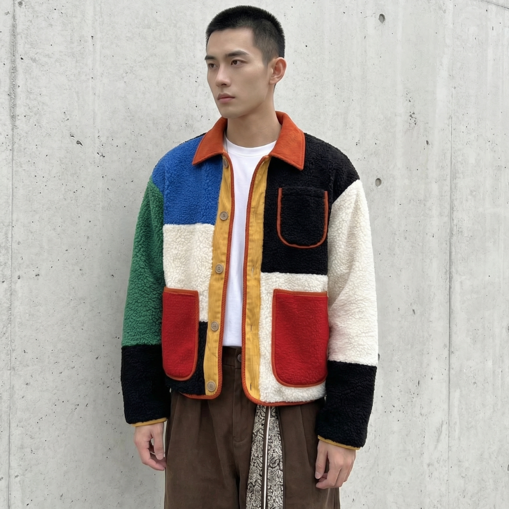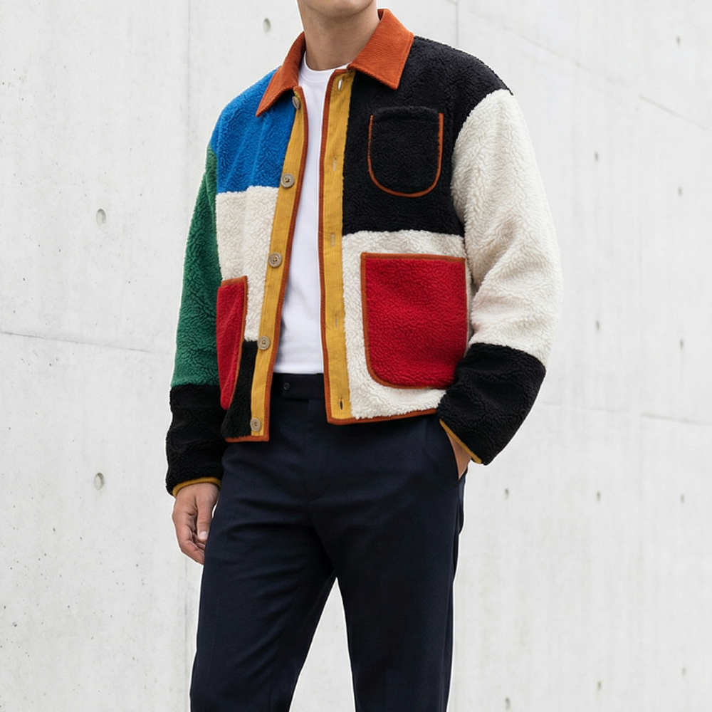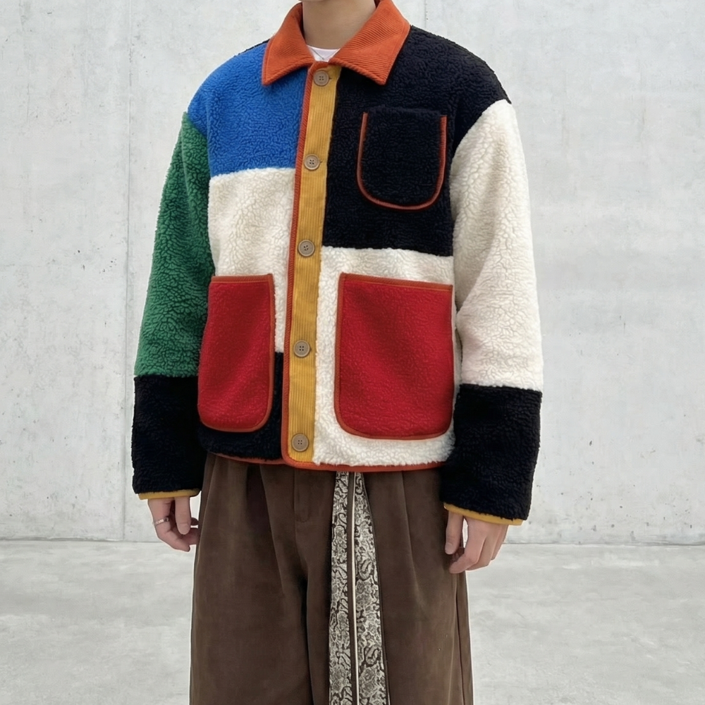 Sherpa warmth meets bold geometry. Each panel claims its own territory—vivid primaries intersect with deep blacks, greens, and cream. Contrast trim traces every edge while oversized patch pockets anchor the composition. The cropped silhouette balances volume with proportion. This is outerwear that refuses neutrality.
