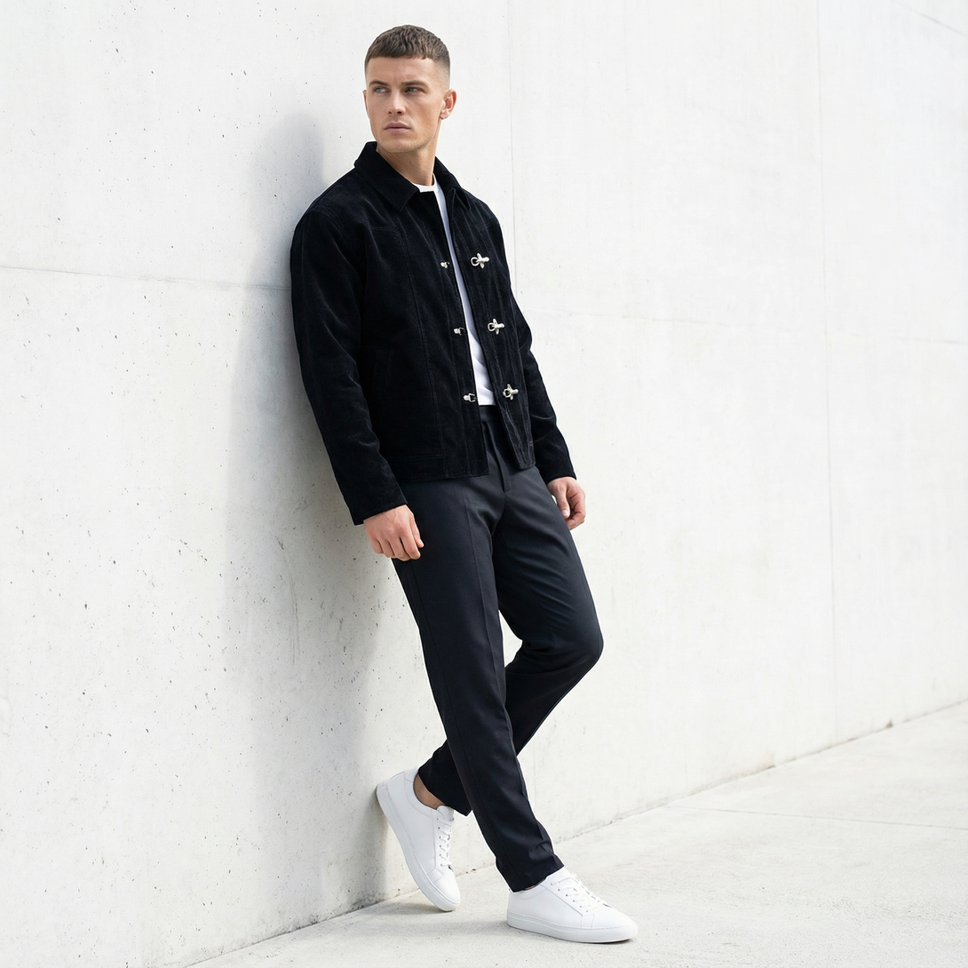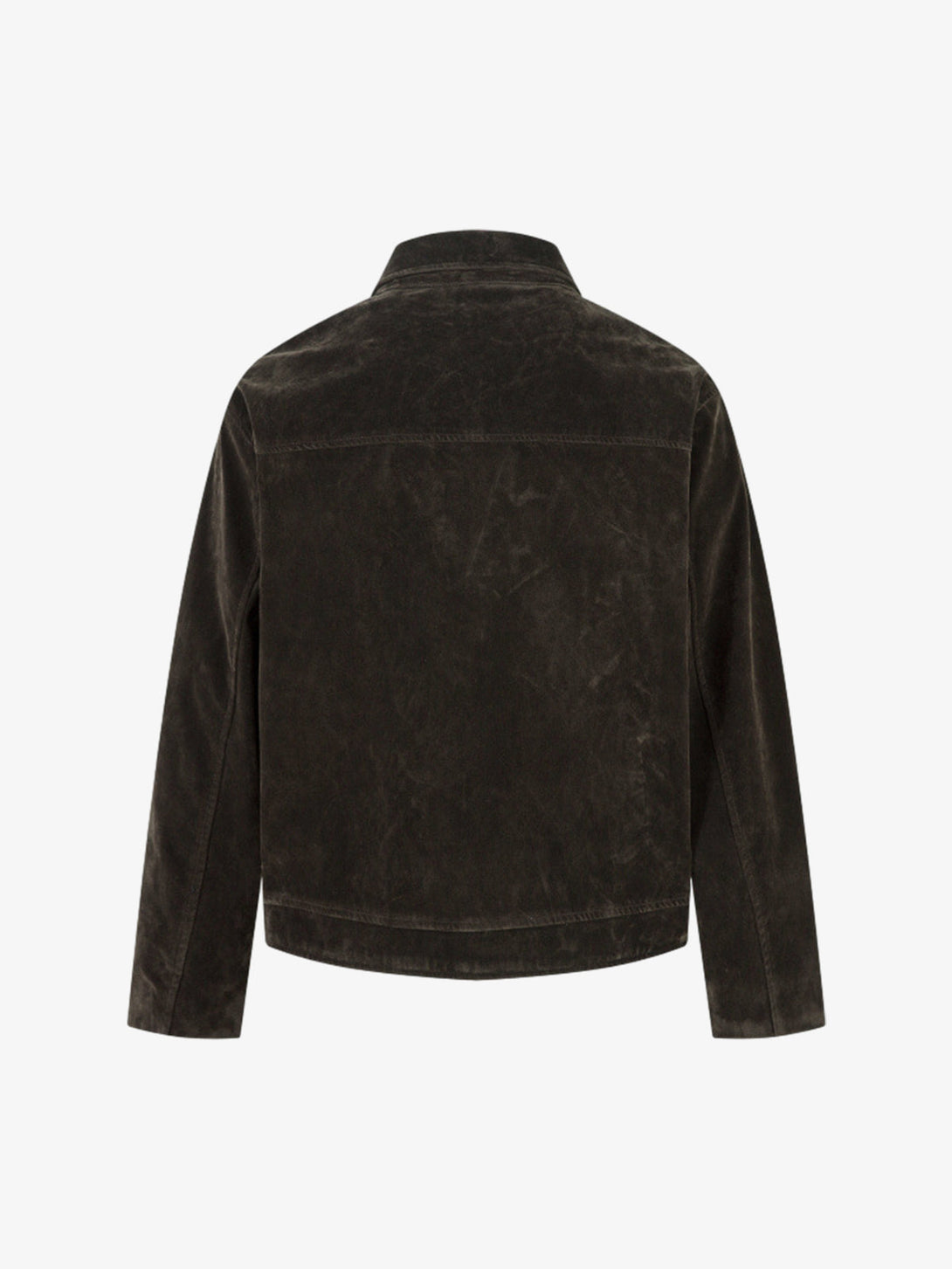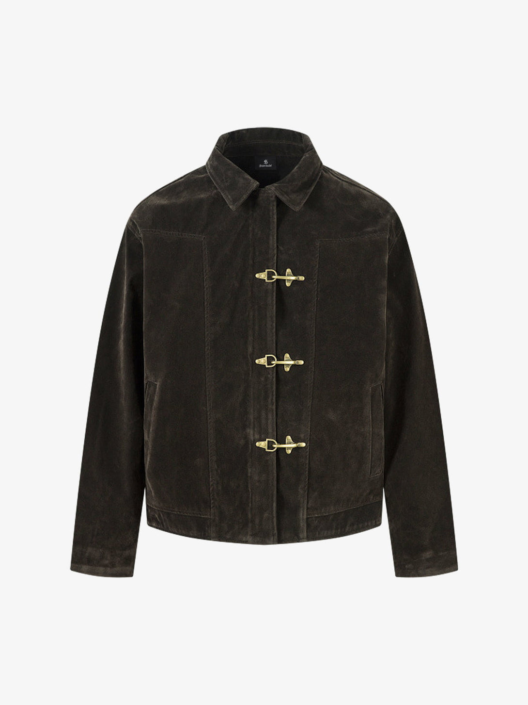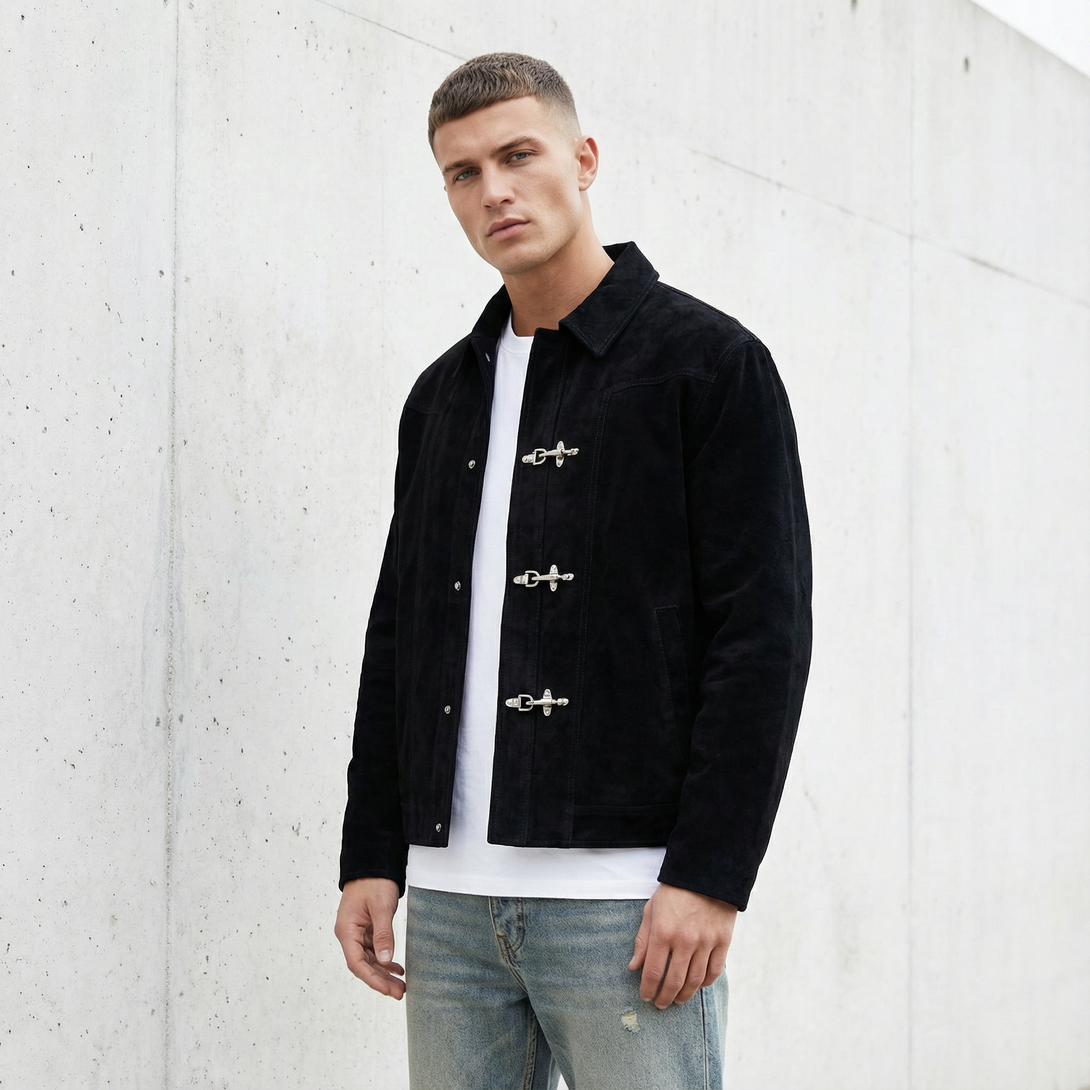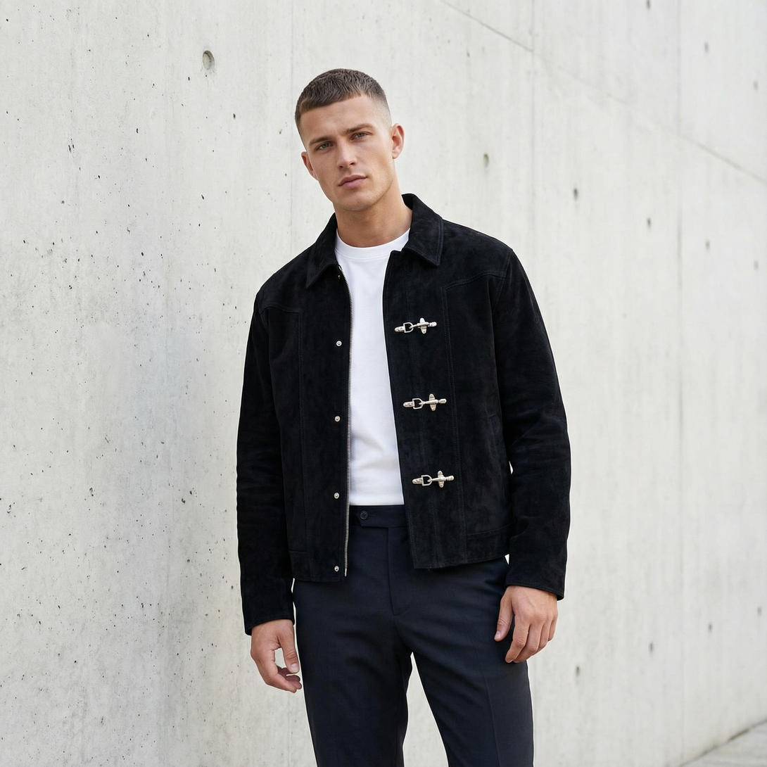 Suede that ages like it should. The cropped silhouette balances structured tailoring with vintage toggle closures—metal hardware that anchors the minimal design. Collar lapels frame the face while dual chest pockets add utility without disruption. This is outerwear that improves with time.