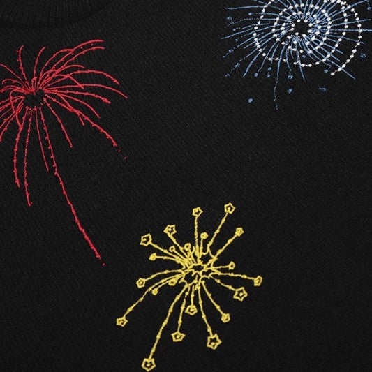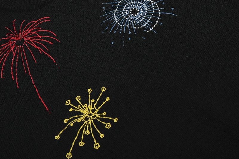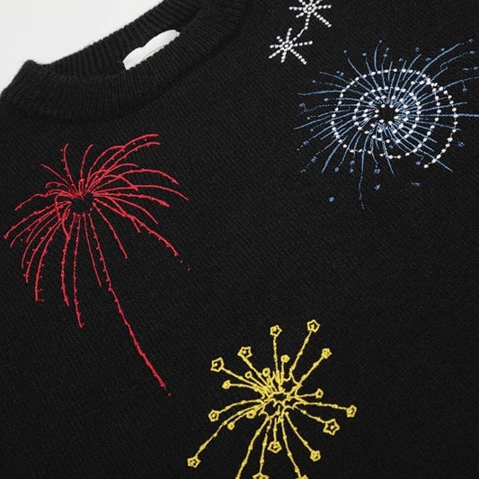 Premium black knit meets celebration embroidery in this essential crewneck silhouette. Hand-stitched firework motifs create bursts of color across the canvas, transforming classic knitwear into wearable moments of joy. Relaxed proportions and soft-touch construction deliver comfort that matches the optimistic spirit.