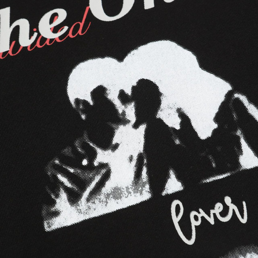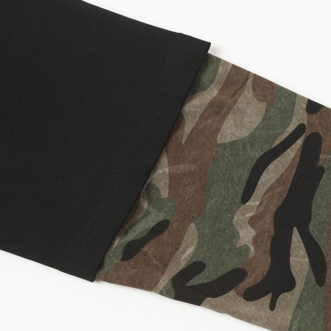 Oversized tee meets long sleeve layering—graphic romance imagery contrasts with camo sleeves. The juxtaposition creates tension: soft sentiment over military edge. Typography layers meaning on meaning while the double-sleeve construction adds depth without bulk. This is contradiction worn intentionally.