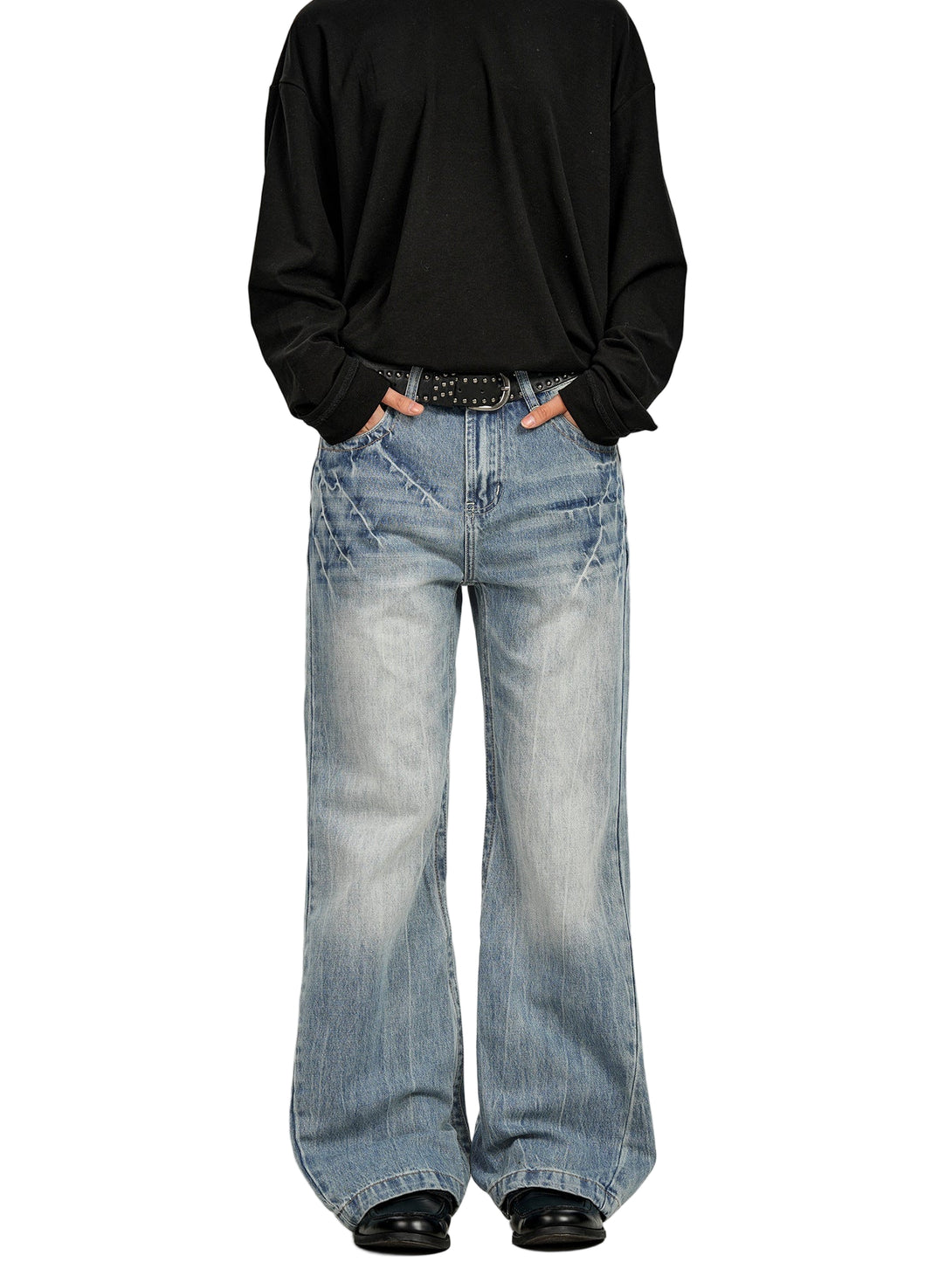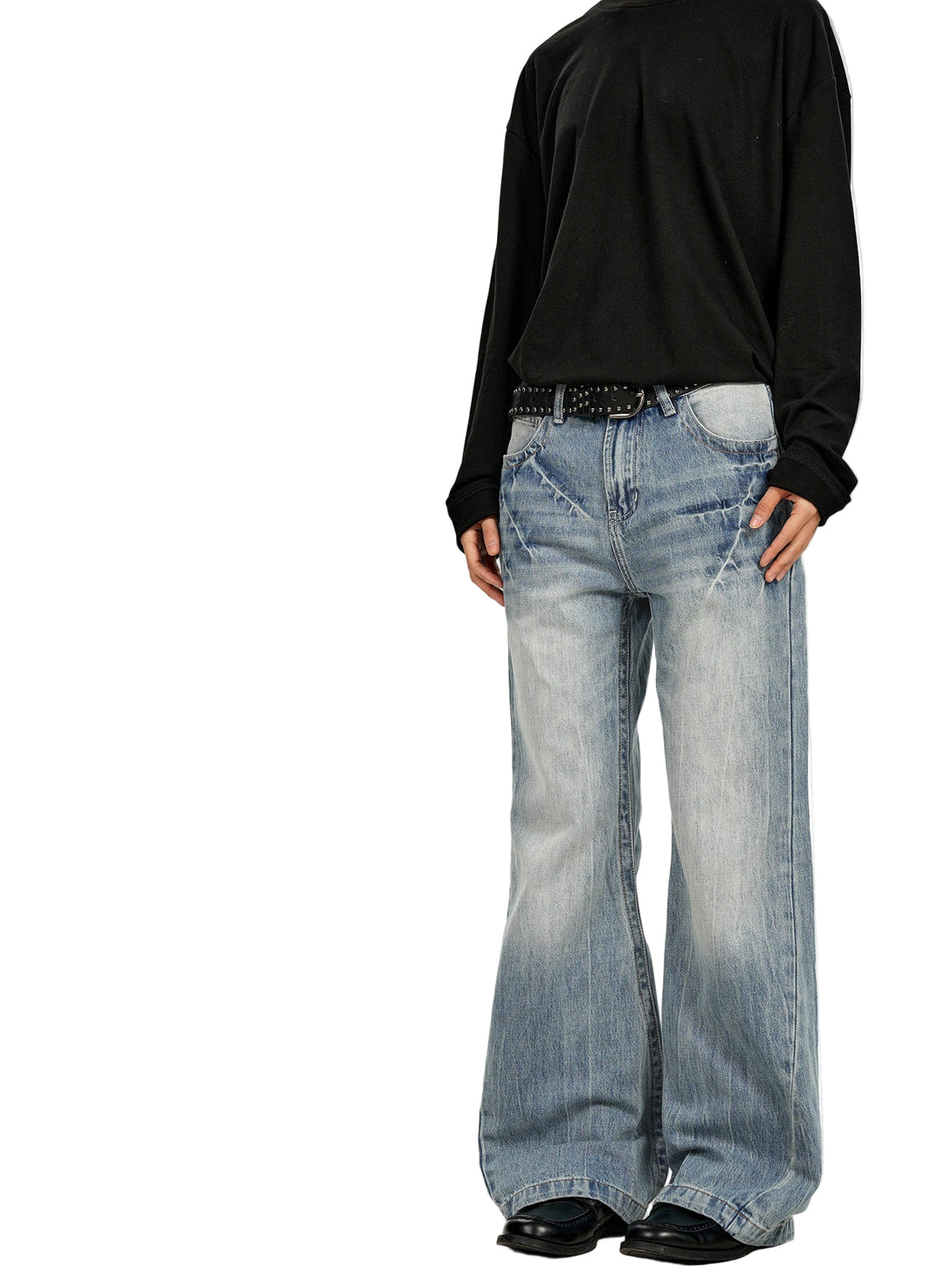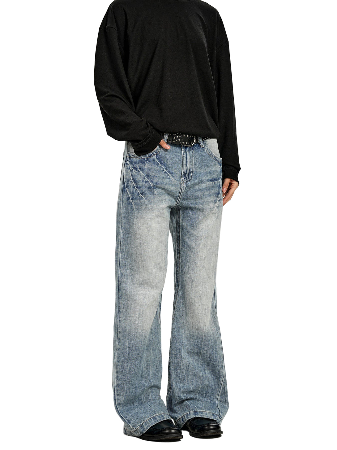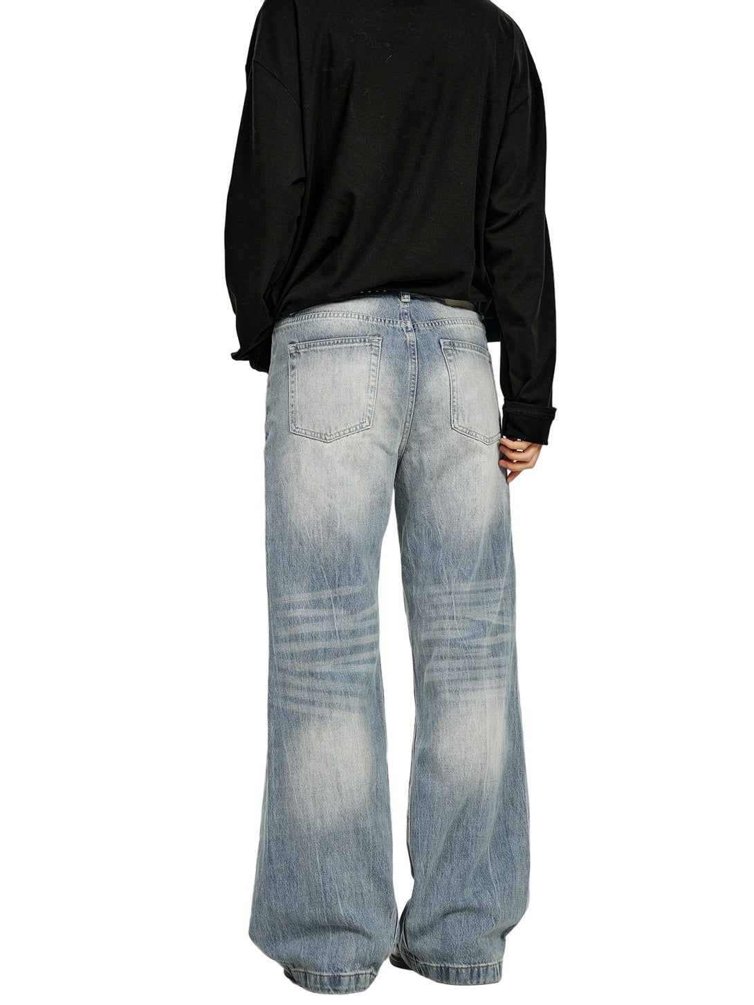 Light-wash denim marked by lightning strike fades—organic patterns that trace movement across the thighs. The micro-flare silhouette creates elongated lines while the mid-rise waist sits exactly where it should. Graduated wash from deep indigo to pale blue tells the story of authentic wear without the wait.