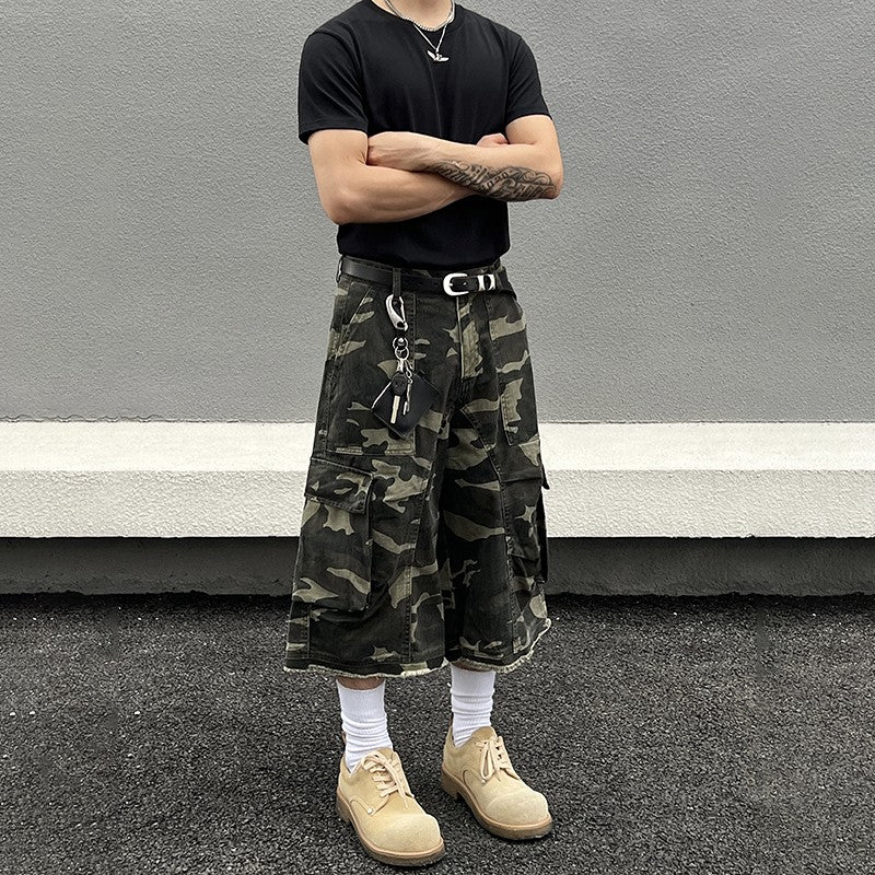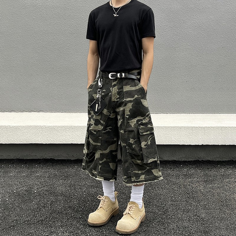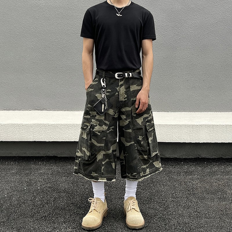 Our Military Camo Cargo Jorts are built from heavyweight cotton canvas with authentic camouflage patterning designed for urban utility with military-inspired aesthetics. The high-waisted construction and wide-leg silhouette create contemporary streetwear proportions, while our multi-pocket cargo system delivers serious storage capacity without compromising style. Raw hem finishing and strategic pocket placement create pieces that blend tactical functionality with everyday wearability.