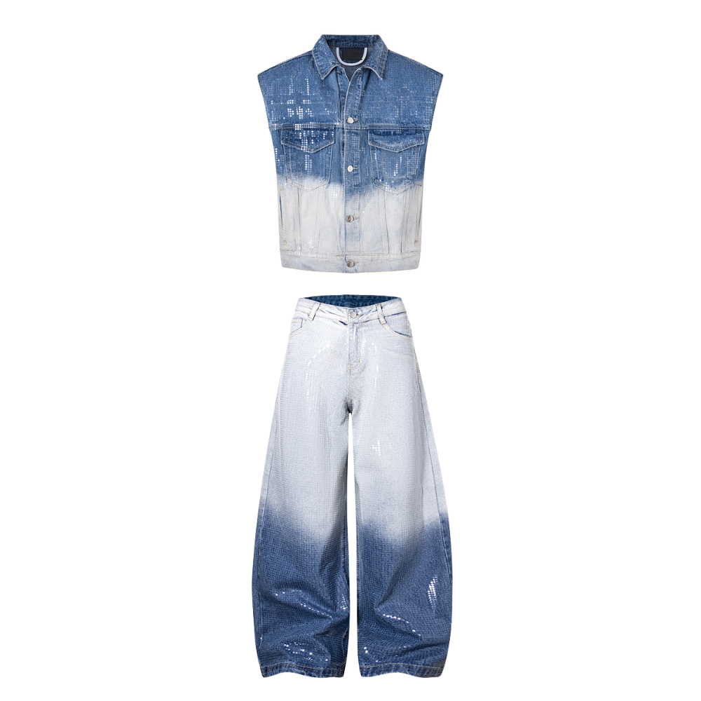 Blue gradient denim with precision-placed sequin embellishment. Light-to-dark ombre wash for those who understand that shine isn't decoration—it's declaration.