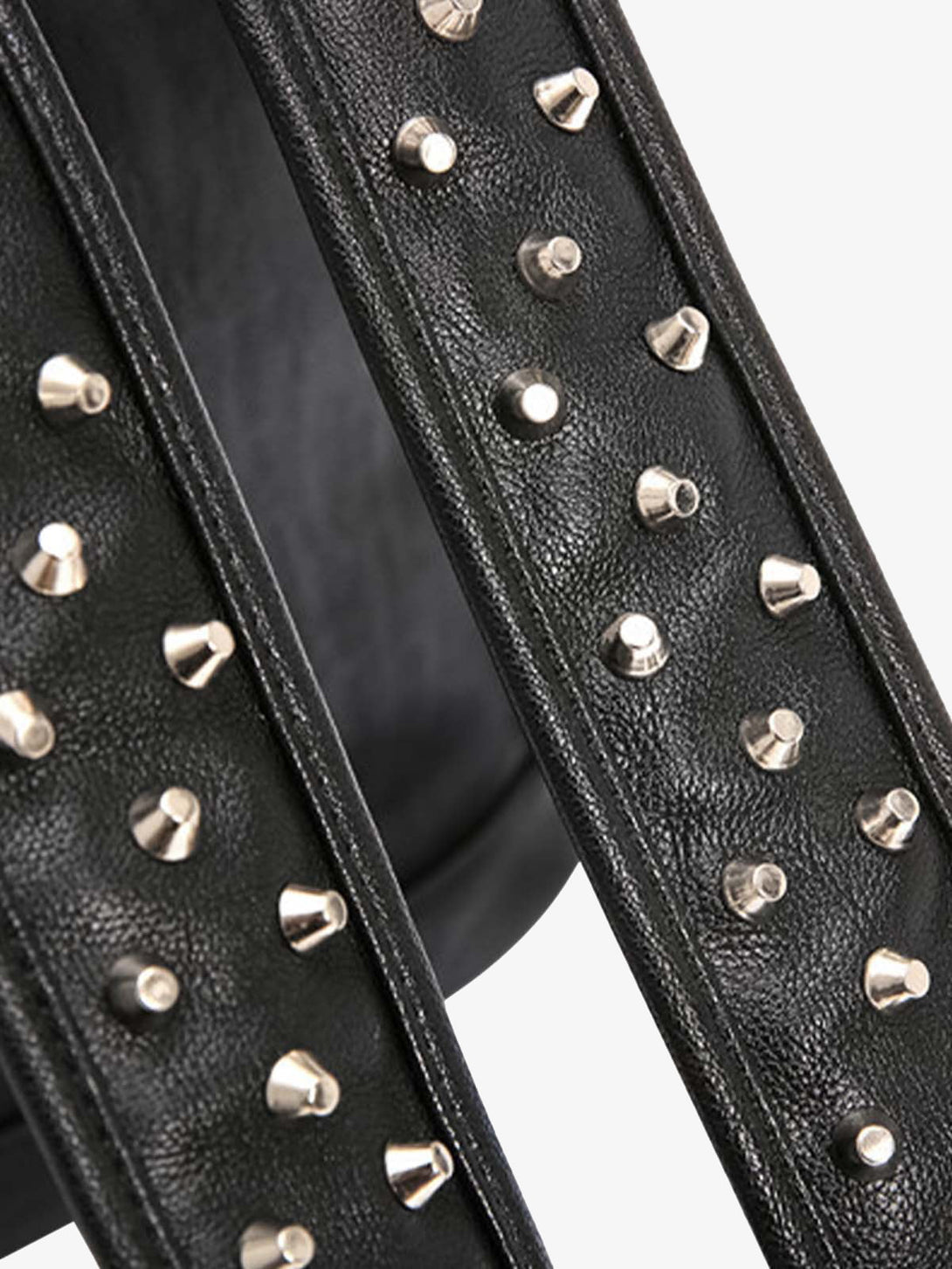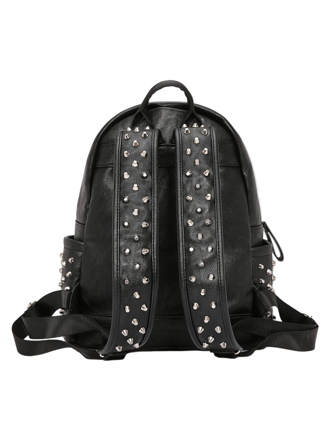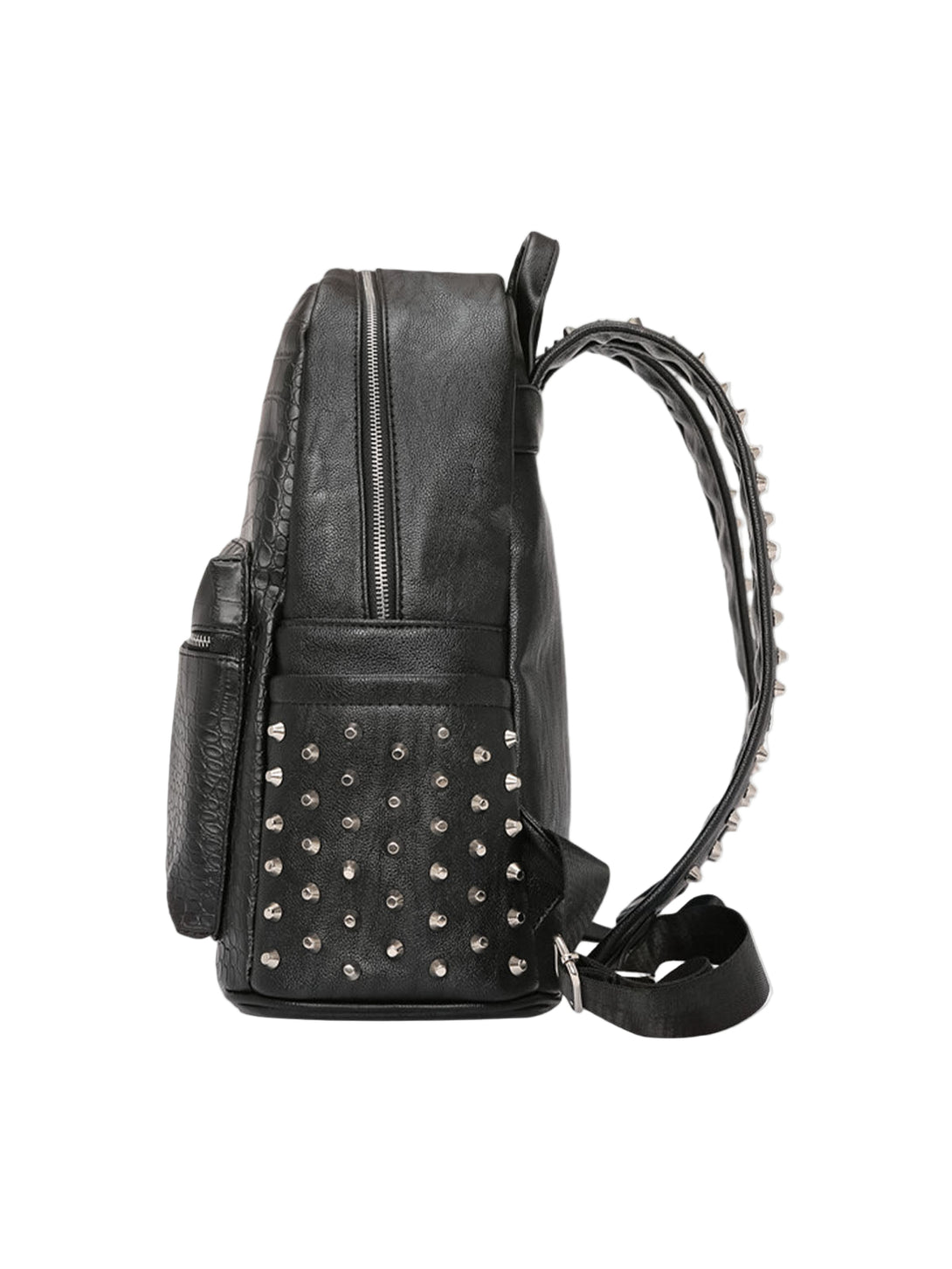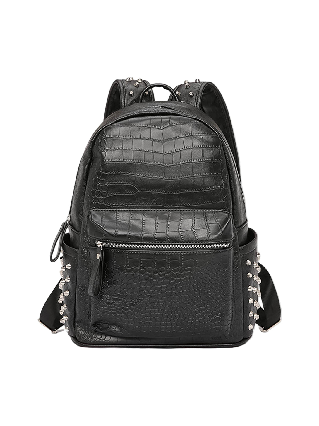 Crocodile-embossed leather meets studded straps in functional luxury. The structured silhouette maintains shape under weight while silver studs trace every strap line. Multiple zip compartments organize essentials without sacrificing aesthetic. Top handle and adjustable straps adapt to how you move.