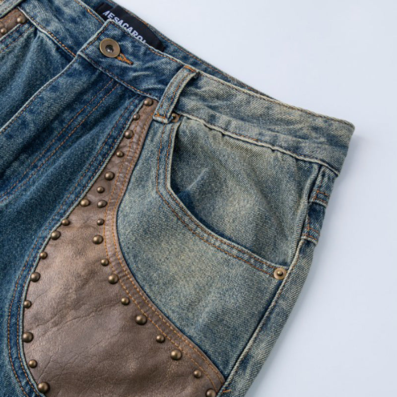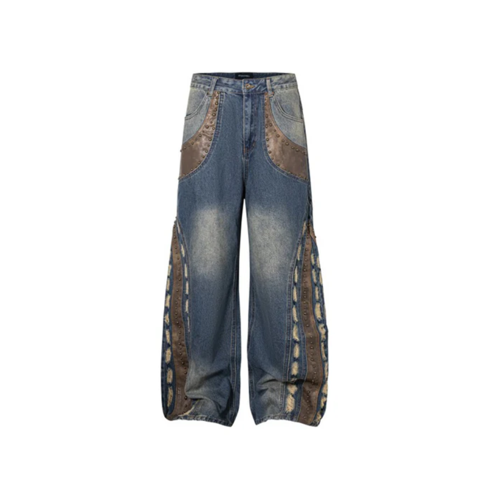 Blue cotton denim with brown panel inserts and strategic stud placement. 90% cotton construction with zip fly closure for those who understand that embellishment isn't decoration—it's declaration.